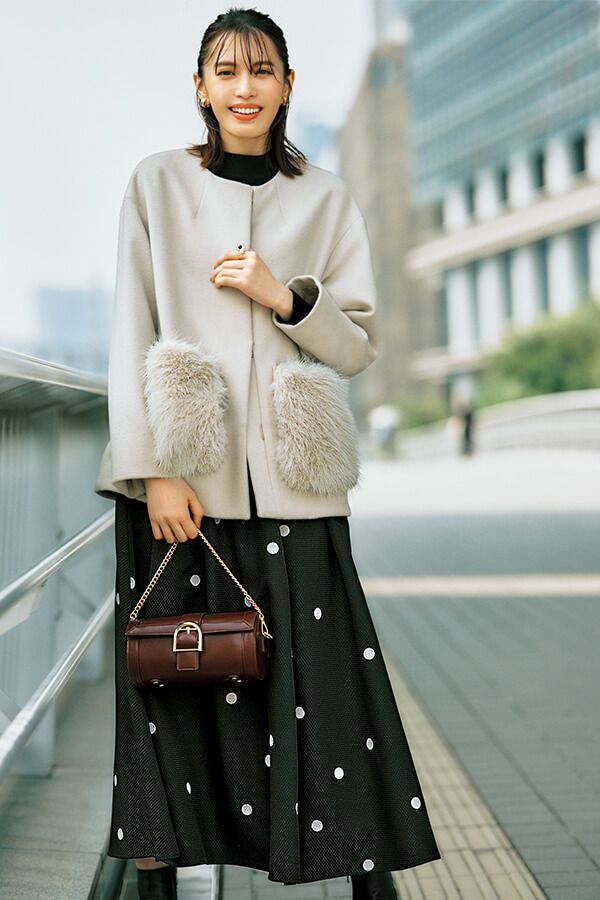 コート¥24,750/トゥエルブアジェンダ(TOKYO GEIMU) ニット¥9,350/Noëla ドット柄スカート¥20,900/ジャスグリッティー イヤリング¥14,300/ランバン オン ブルー(ヴァンドームヤマダ) リング¥9,900/オーロラ(ロードス) バッグ¥19,250/ダイアナ(ダイアナ 銀座本店) ショートブーツ¥37,400/卑弥呼