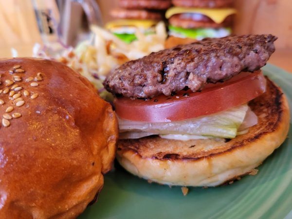 出来立てホヤホヤのアツアツです!ハンバーガーの具材は、パティ・レタス・トマト・玉ねぎ・マヨネーズ・塩・胡椒。ポテト・オニオンリング・サラダ付きです。