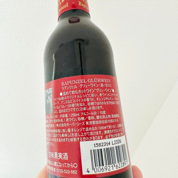 「ラプンツェル グリューワイン」には、今回購入した250ml(¥352)と、1,000ml入り(¥1,111)の2サイズあり、それぞれ赤ワインと白ワインがあります。ちょっとお試し感覚なら、小さめマグカップに約2杯分の「ベビー」サイズがぴったり。フルーティで優しい香りのグリューワインは、寒い日の夜をほんわかと温めてくれそうですね。