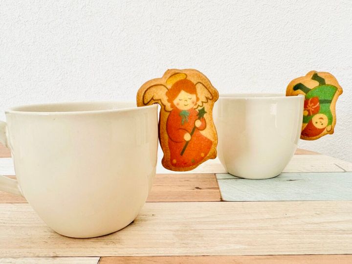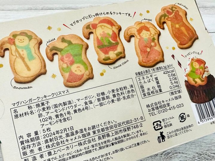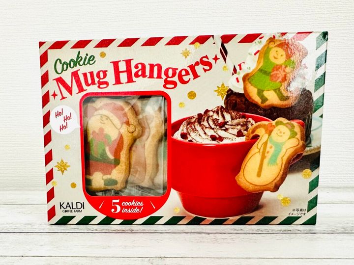 数量限定商品で、マグカップに引っかけるタイプのクッキーです。サンタやスノーマンなど、5種類のデザインが1枚ずつ入っていますよ。