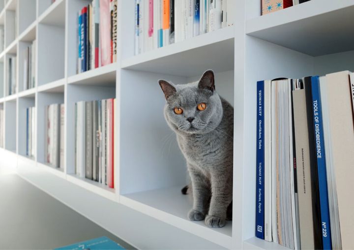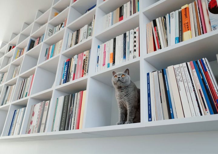 本棚には、ニンゲンがせっせと集めた本がいっぱい。こんなところに、いい隙間が!