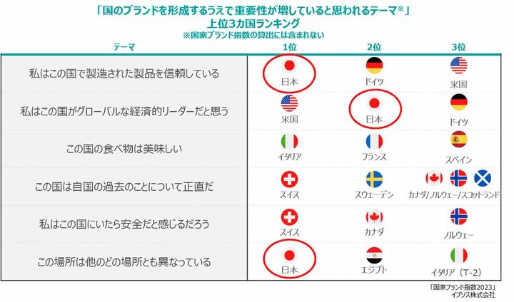さらに、2023年から新たに、国家ブランド指数の算出には含まないものの、「国のブランドを形成するうえで重要性を増していると思われるテーマ」についても調査をしており、その中の「私はこの国で製造された製品を信頼している」「この場所は他のどの場所とも異なっている」という項目で、日本は60カ国中トップの評価を得ました。