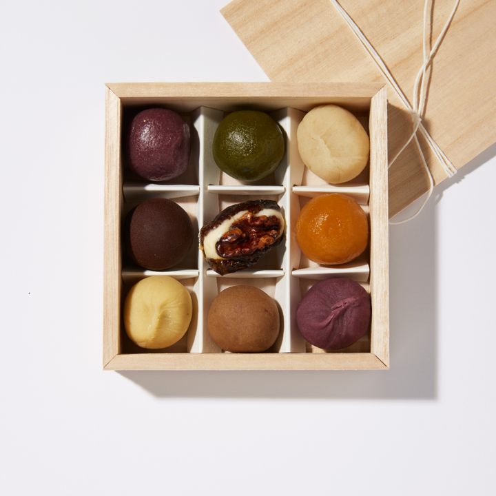 「高級感のある桐箱を開けると、色とりどりの可愛らしい『ひと口果子』がきれいに並べられています。チーズやカシューナッツ、栗甘露煮を餡で包み込んだものに加え、ブランドを代表するお菓子の一つ『棗バター』まで、計9種の一風変わった和菓子を堪能できます。ひとつひとつ個性が光るので、飽きずに食べ進められるはず。日本茶はもちろん、コーヒーやお酒と一緒にいただくのもおすすめです」(桶谷さん)