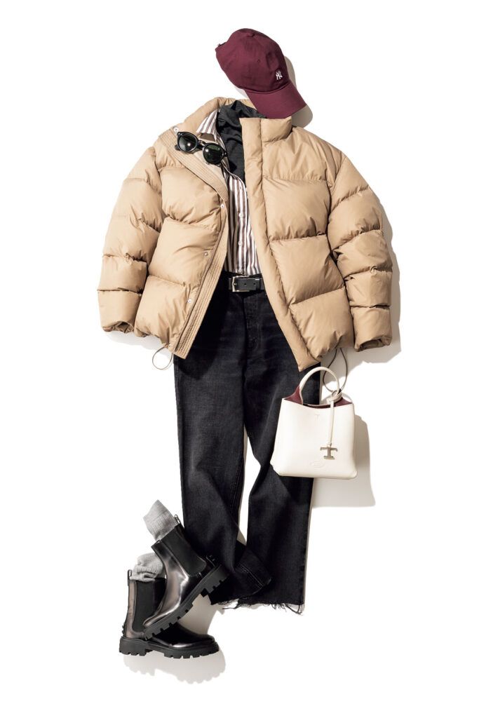 デニム¥42,900(シチズンズ・オブ・ヒューマニティ)ダウンジャケット¥66,000ベルト¥14,300(ともにウィム ガゼット/ウィム ガゼット ルミネ新宿店)シャツ[参考価格]¥47,300(フィナモレ/アマン)ニット¥19,800(ユナイテッドアローズ/ユナイテッドアローズ 渋谷スクランブルスクエア店)帽子¥4,400〈ニューエラ〉ソックス¥4,180〈パンセレラ〉(ともにシップス インフォメーションセンター)バッグ¥185,900ブーツ¥113,300(ともにトッズ/トッズ・ジャパン)サングラス¥46,200(モスコット/モスコット トウキョウ)
