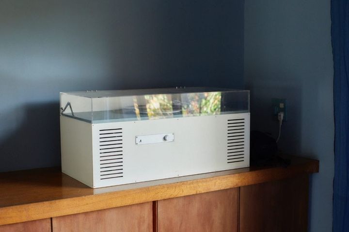 ドイツのインダストリアルデザイナー、ディーター・ラムスのデザインによるBRAUN社製のレコードプレイヤーを彷彿させる白のレコードプレイヤー。アトリエに放置された板の中から状態のよいものを選んで制作。ブルーを基調としたリビングに白のレコードプレイヤーが映えます。
