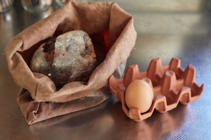 梱包材や包装材、容器など、ゴミが出てしまいがちな日々のお買い物。中村さんは、量り売りのお店なども積極的に利用し、買い物時のゴミを出さないように心がけています。 :「陶器製の卵ケースは夫が見つけて買ってきてくれたもの。この卵ケースを持参して、週に一度、自然農を営むファームの平飼い卵を購入しています」 :柿渋染めのオーガニックコットンに蜜蝋コーティングが施されたバッグ。「蜜蝋コーティングされているので、油分の多いドーナツや惣菜パンなどを買って入れても油が染み出さず安心! マルシェやイベントのときのテイクアウトにも便利です」