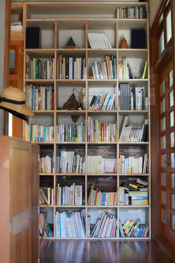 玄関を開けてまず目に飛び込んでくるのが、天井までの高さを誇る大きな本棚。家族全員本が大好きという中村家にぴったり。それぞれのお気に入り本がずらりと並び、廊下がライブラリーのような素敵な空間に。