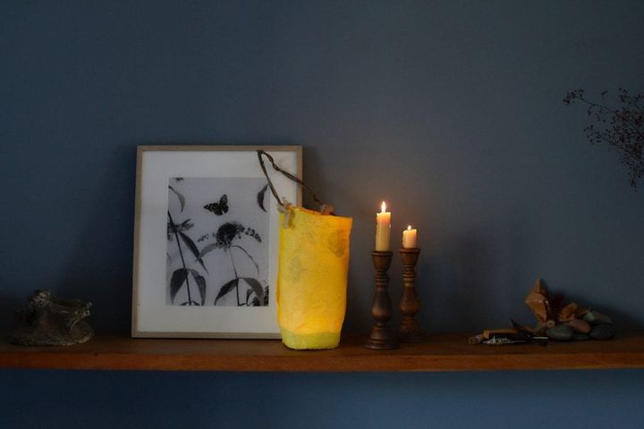 息子・樹根くんが学校で作ったランタンは、自分たちで漉いた和紙を使用。アクセントになっている羊毛も自分たちで紡いだもの。ほんのりとした灯りに心も癒やされます。
