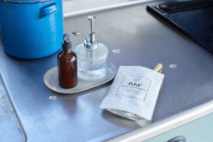 キッチンまわりに多いプラスチックのパッケージや合成洗剤なども、環境に配慮したものや手作りのものにチェンジ! #01:エシカルクリーニングに欠かせない、産業廃棄物であるホタテの貝殻をアップサイクルしたマルチパウダー。「掃除、洗濯、消臭など家中どこでも使える万能選手です」。 #02:「ガラス製のスプレーボトルにアルコール度数の高いウォッカを入れて除菌・消毒スプレーとして使っています」。ノズル部分とスプレー部分は真鍮製でプラスチック製のものより丈夫。 #03:遮光瓶には、みかんなどの柑橘類の皮を活用した自作のオレンジクリーナーを。手にも環境にもやさしく、水に入れて煮出すだけだからお手軽で簡単!