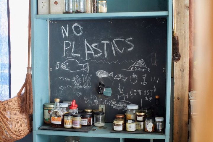もともと別荘だった一軒家を日々リノベーション中。水場跡にはキッチンストッカーを製作。棚には量り売りで購入した瓶の食材や、エシカルな調味料などが並びます。黒板には息子の樹根(じゅね)くんによる、中村家の台所の哲学「NO PLASTICS」とお魚の絵が描かれています。すぐ目にとまるところに目標を掲げることで、普段から意識を。