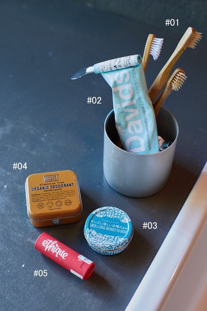 プラスチックのパッケージが使われがちなコスメやスキンケア用品。「歯ブラシや歯磨き粉、リップや下地などのメイク用品も環境にやさしいものを選んでいます」 #01:柄の部分にプラスチックを使わない、バンブー(竹)製の歯ブラシを使用。歯ブラシとしての役目が終わったらお掃除用に。 #02:天然原料のみをベースとしたDavidsのハミガキ粉。リサイクル可能なアルミ製のチューブも◎。 #03:100%自然由来成分で作られた沖縄発の「サンゴに優しい日焼け止め」。パッケージはスチール缶を使用。 #04:アルミニウムフリー、パラベンフリーで敏感肌にもやさしいNOOSA BASICSのオーガニックデオドラントクリーム。 #05:ニュージーランド発のサステナブルブランドethiqueのプラスチックフリーのリップバーム。紙製のパッケージで、中身を使い終わったら、家庭でコンポスト(堆肥化)が可能。