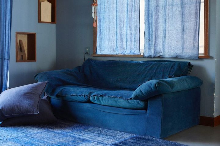 「ソファカバーも自分たちで藍染めしました。色がだいぶ褪せてきたので、もう一度染め直したいですね」。経年変化を楽しみながら長く愛用できる藍染め。使うほどに少しずつ色が抜け、その独特の風合いも魅力。リネンのカーテンは中村さんのお母さんの手作り。
