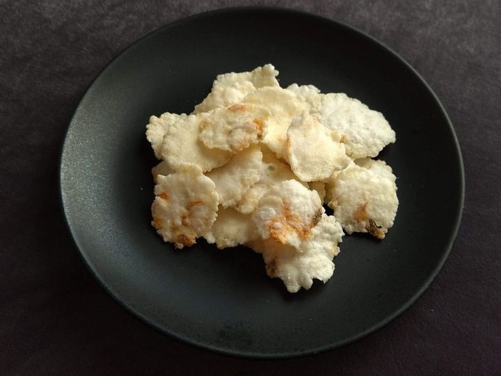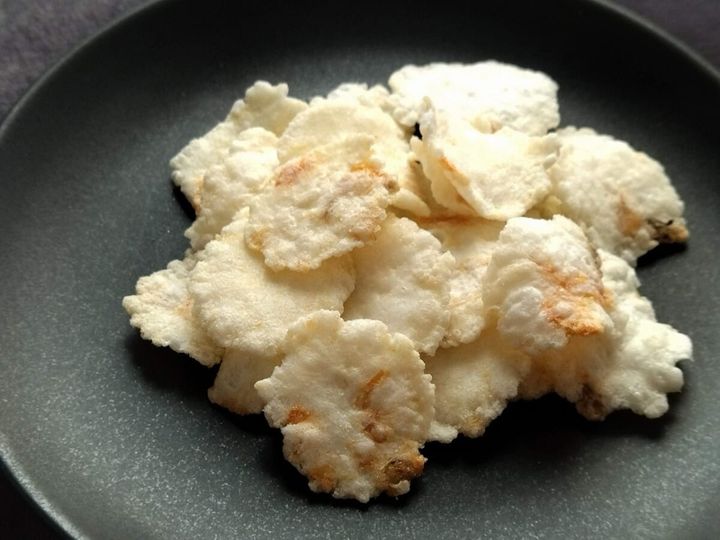 厚みがあり、しっかりした歯ごたえのある真っ白なせんべいには、ところどころにエビの姿が。塩味の中に広がるエビの風味が優しい一品です。