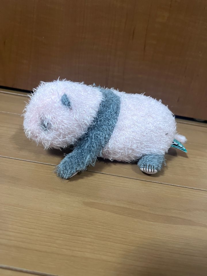 産まれて13日目のシャオシャオ。このぬいぐるみ産まれて13日目の286gの重さがあるんです。ほんのりピンクで可愛いです。