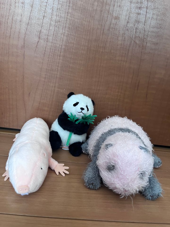 三姉妹が選んだお土産、ハダカデバネズミ、パンダのレイレイ、産まれて13日目シャオシャオ。