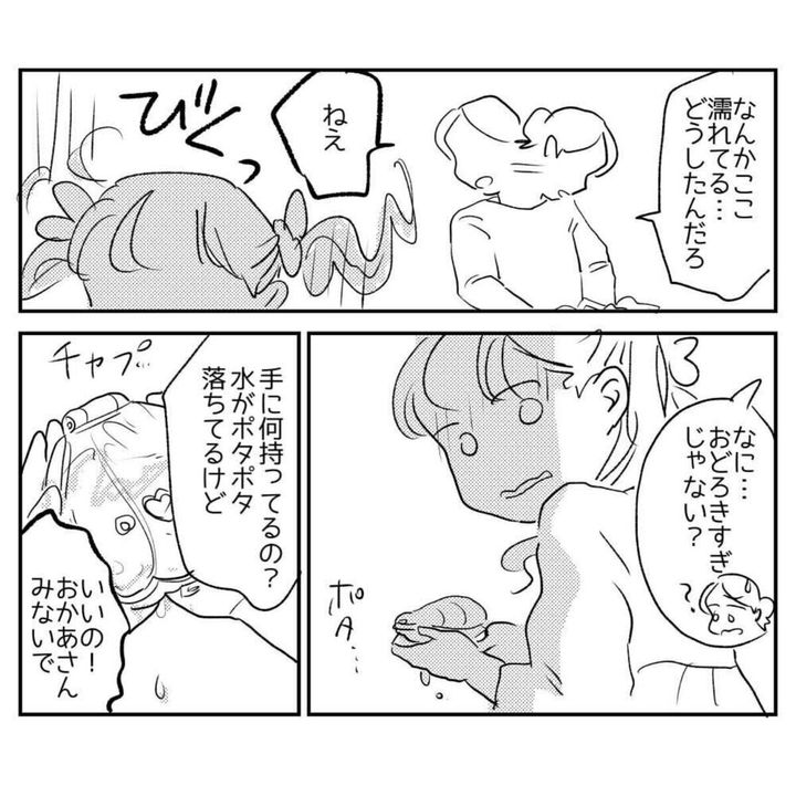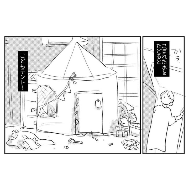 ある日、廊下に水がこぼれていることに気づいた さざなみさん。どうやら、水をこぼしたのは長女のようです。そして、翌日も同じように水がこぼれています。水滴をたどったところ、子ども用テントに行きつきました。中をのぞいてみると、テントの中に水を持ち込んでいる様子。一体、何をしているのでしょう。
