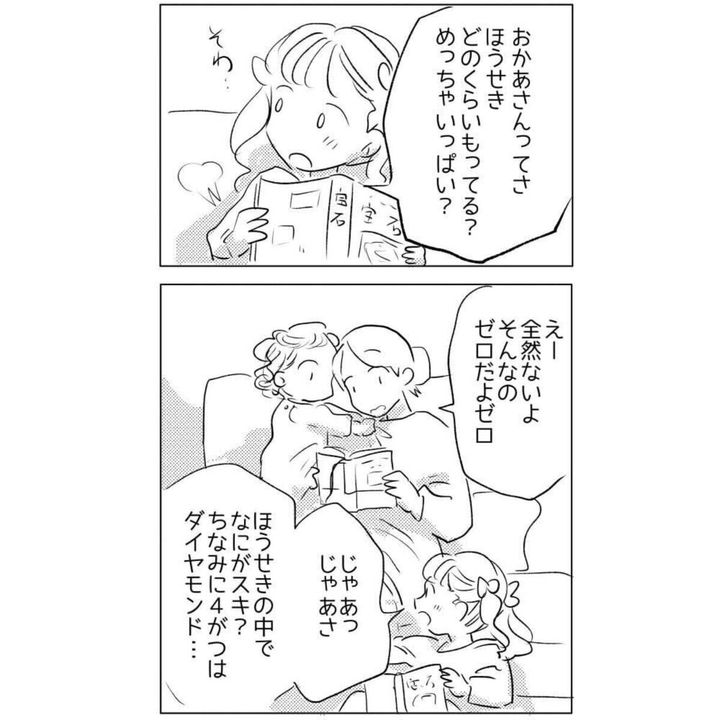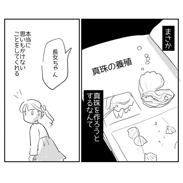 お母さんの言葉を聞いて、なんと自分で「真珠」を育てようとしていた長女。きっと、内緒でお母さんをよろこばせたかったのですね。子どもの思いがけない行動に驚かされつつも、とてもほほえましいエピソードでした。