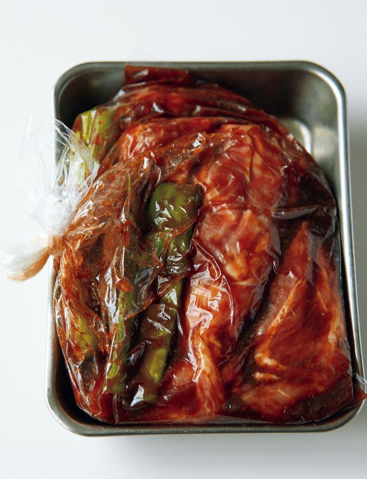 厚手のポリ袋にたれの材料を入れ、豚肉を入れてもみ込む。空気を抜いてしっかり口を閉じ、冷蔵庫に3時間ほど置く。オーブンを220℃に温めはじめる。