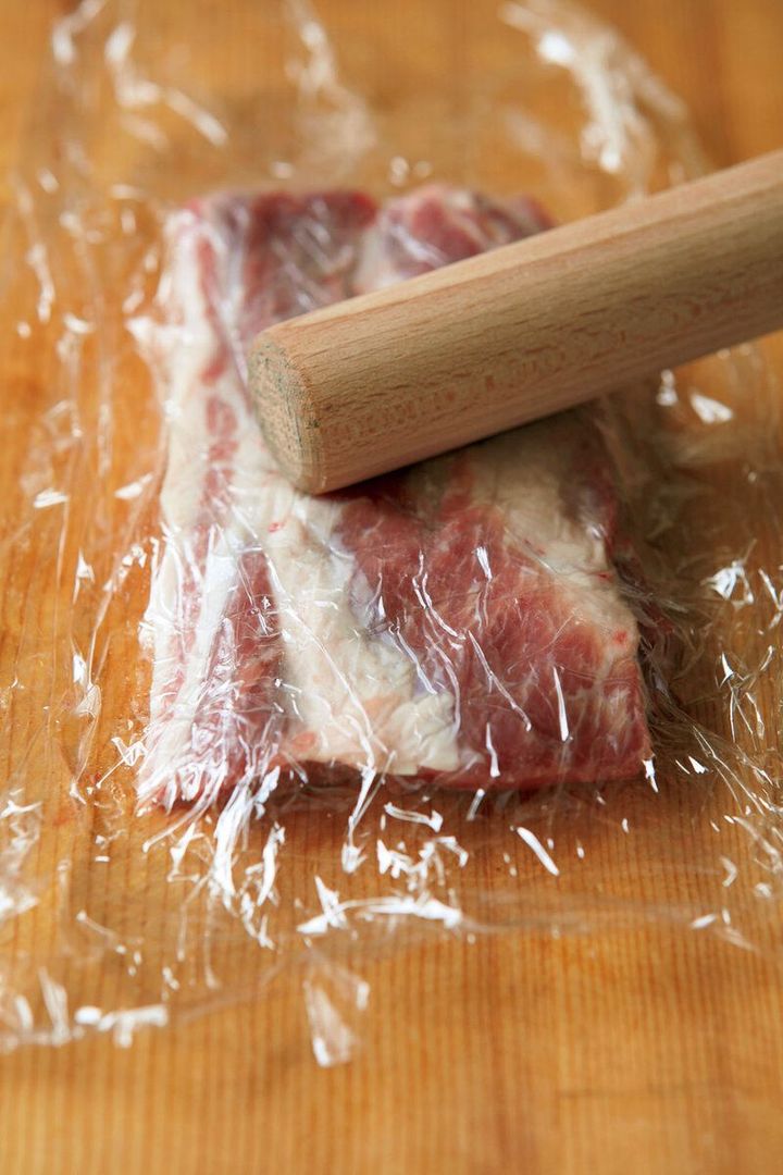 短時間で焼き上げるため、厚みを薄くするのがマスト!めん棒でたたくことで肉の繊維がこわれ、食べやすく。