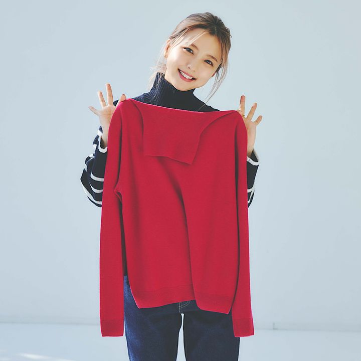 【着用衣装】ボーダーニット¥2,990(UNIQLO)デニム¥26,400(リーバイス®/リーバイ・ストラウス ジャパン)ピアス¥36,300(VENDOME AOYAMA/ヴァンドーム青山本店)左手中指上リング¥19,800(PLUS VENDOME/プラス ヴァンドーム)右手人差し指パール付きリング¥19,800、左手中指下チェーンリング¥11,000(ともにles bon bon)