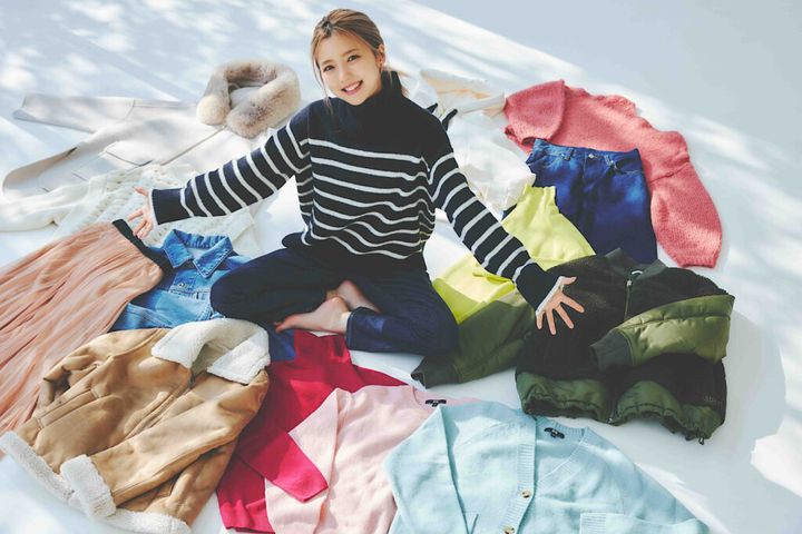 <中央上から反時計回りに>ホワイトプルオーバー¥35,200、ホワイトベージュコート¥71,500、ホワイトニット¥33,000、ピンクスカート¥27,500、デニムジャケット¥39,600(すべてダイアグラム/Diagram 表参道ヒルズ店)ベージュボアブルゾン¥6,990、ピンクタートルニット¥10,900、ライトピンクニット¥2,990、ライトブルーカーディガン¥2,990(すべてUNIQLO)カーキボアブルゾン¥27,500、イエローニット¥15,950、デニム¥15,950、ピンクニット¥14,850(すべてビューティー&ユース/ユナイテッドアローズ 渋谷スクランブルスクエア店)