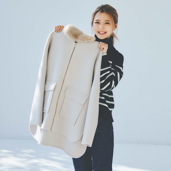 「ひとつひとつのお洋服がしっかりしていて、デザインもとにかく好み。私服はもちろん、スタイリストさんが用意してくれて、テレビ収録の衣装でも着ています。このポンチョコートも実は撮影前にゲットしていました♪」