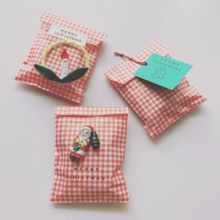 かわいいクリスマスのアイデア③ ギンガムチェックの紙袋をお菓子やハンコでおめかし