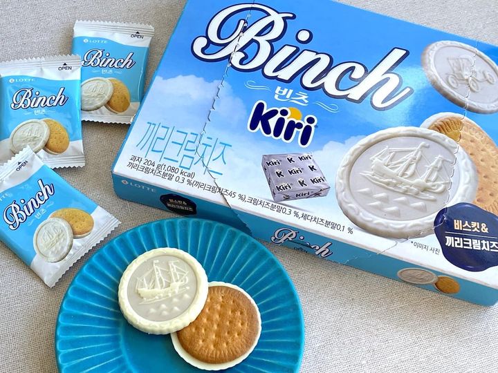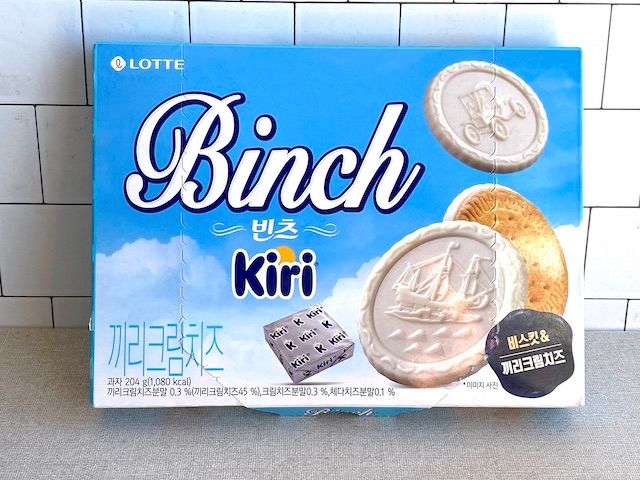 韓国旅行中、お土産を探しにスーパーをブラブラしていて見つけたのがこちら、韓国ロッテとクリームチーズのキリがコラボしたビスケット菓子「ビンツ」です。