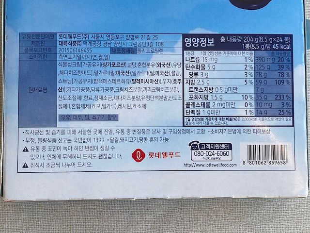 韓国旅行中愛用していた翻訳アプリ「Papago」で翻訳するとこの通り! 製造元や原材料名、栄養情報などでした。1袋(1枚)45kcalあるそうです。