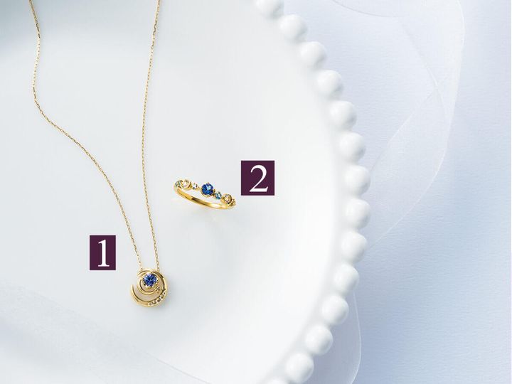 1 青紫色のタンザナイトをメインに据え、寄り添うようにダイヤとトパーズの輝きも。上品でありながらリュクスな一品。