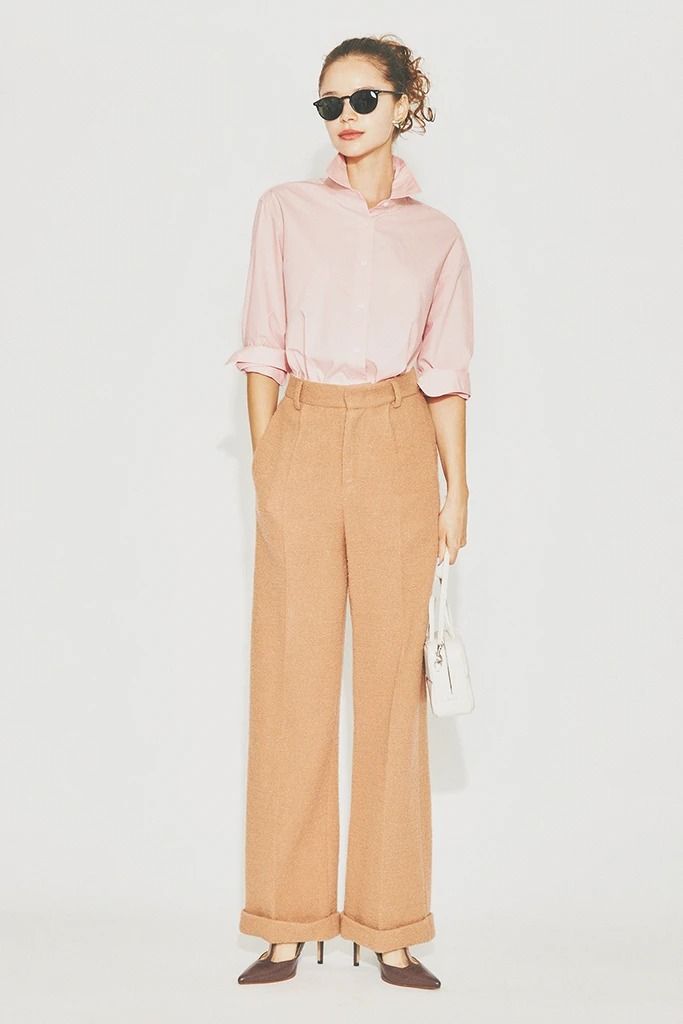 シャツ1枚に季節感を呼び込める、ブークレ調のふかふかしたウールパンツ。コンパクトな腰まわりに加えて、すでにロールアップされたすそデザインなら素材の間のびをOFFできる。センタープレス入りのストレートパンツに、シャツとヒールでキレイに合わせても素材や色みで力を抜けば、おかたさもなくシーンレスなスタイリングに。