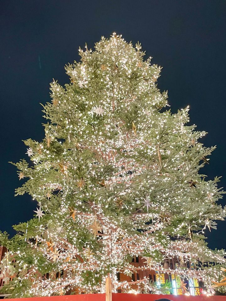 ライトアップされ星のモチーフがキラキラ輝く大きなクリスマスツリー