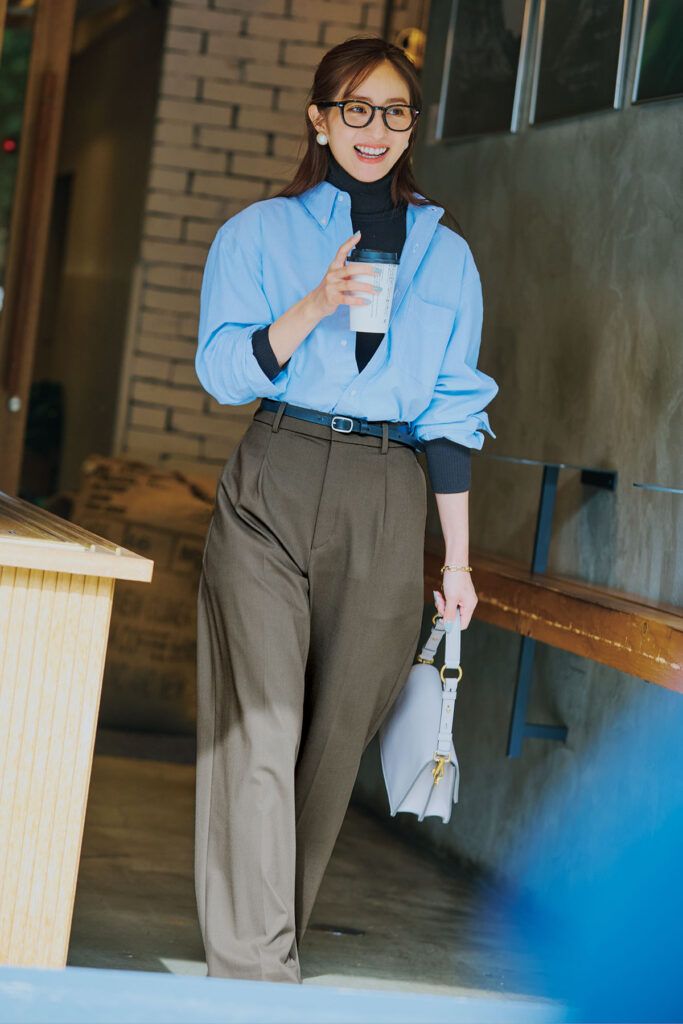 エクストラファインメリノリブタートルネックセーター¥2,990タックワイドパンツ¥3,990ベルト¥2,990シャツ[メンズ]¥2,990(すべてUNIQLO)バッグ¥300,300(トッズ/トッズ・ジャパン)メガネ¥38,500(アイヴァン/アイヴァン 東京ギャラリー)ピアス¥5,940(アビステ)ブレスレット¥8,800(イン ムード/フォーティーン ショールーム)