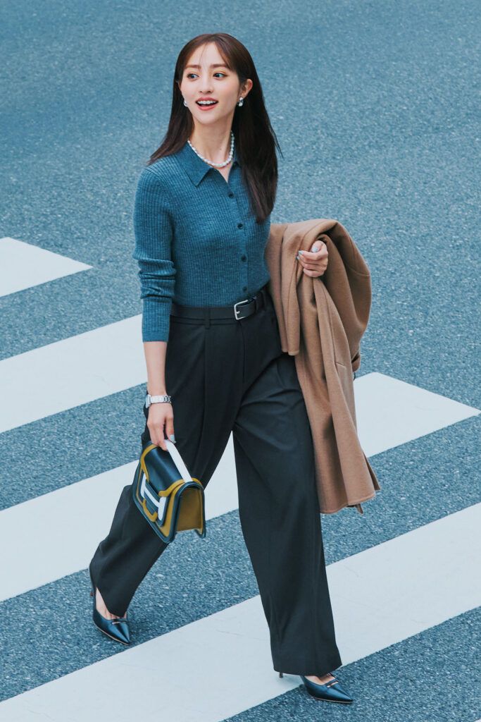 エクストラファインメリノリブポロカーディガン¥3,990タックワイドパンツ¥3,990ベルト¥2,990手に持ったコート¥12,900(すべてUNIQLO)バッグ¥170,500(ピエール アルディ/ピエール アルディ 東京)パンプス¥59,400(ペリーコ/アマン)イヤリング¥6,300(アビステ)ネックレス¥10,780(エイチアッシュ/フォーティーン ショールーム)時計¥17,160(クルース/HIROB ルミネ新宿店)