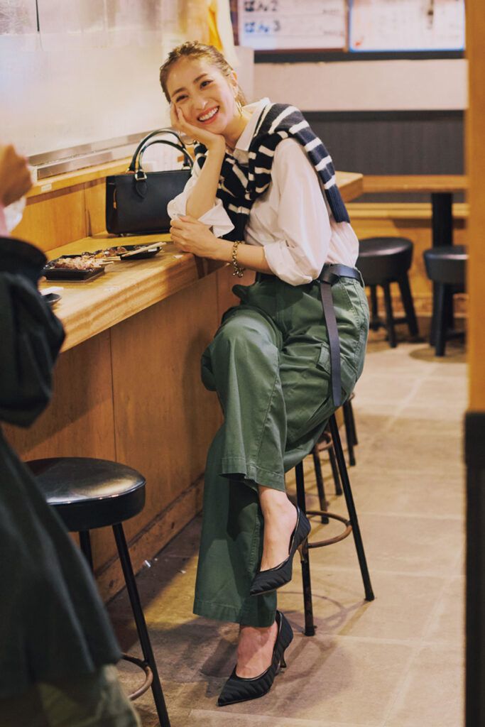スフレヤーンボーダーハイネックセーター¥2,990ワイドストレートカーゴパンツ¥3,990シャツ¥2,990(すべてUNIQLO)ベルト¥10,450〈レフィエ〉バッグ¥25,300〈メゾン ヴァンサン〉(ともにフラッパーズ)パンプス¥59,400(ネブローニ)ピアス¥8,800(アビステ)ブレスレット¥9,350(イン ムード/フォーティーン ショールーム)