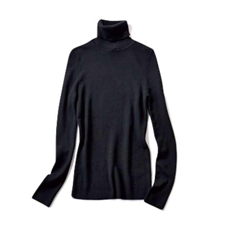 一枚あると便利なタートルは冬の名脇役。細いリブかつ、締め色になる黒なら間違いありません。タートルニット¥2,990(UNIQLO)