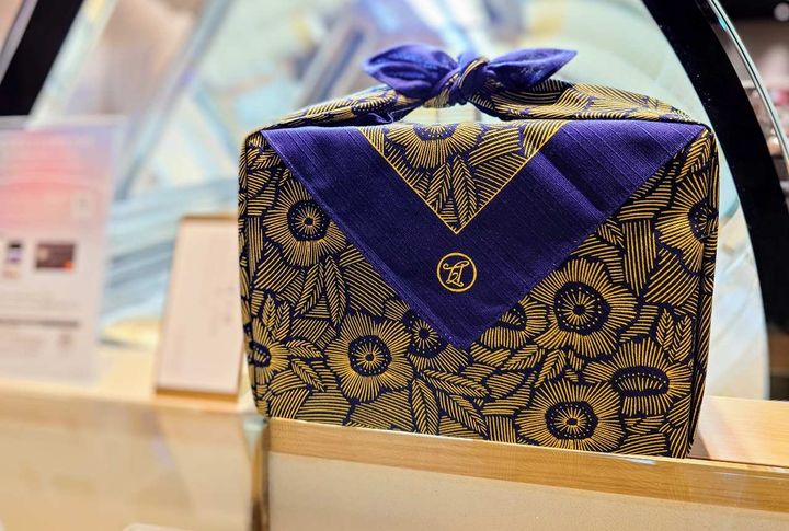 金と藍の花が咲くオリジナル風呂敷(別税込1,100円)で包むと贈答品にもなります(焼きたて・箱、生どらやきはすべて消費期限は2日間)。