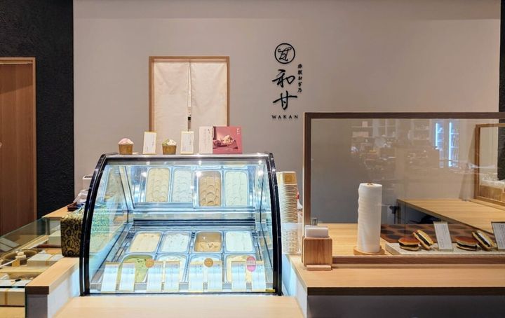 和の情緒を残したスタイリッシュな店構えで、荻野さん完全監修の生どらやきと和のジェラートたちが並んでいます。鉄板の隣にはイートインを3席設け、できたてをすぐにいただけます。