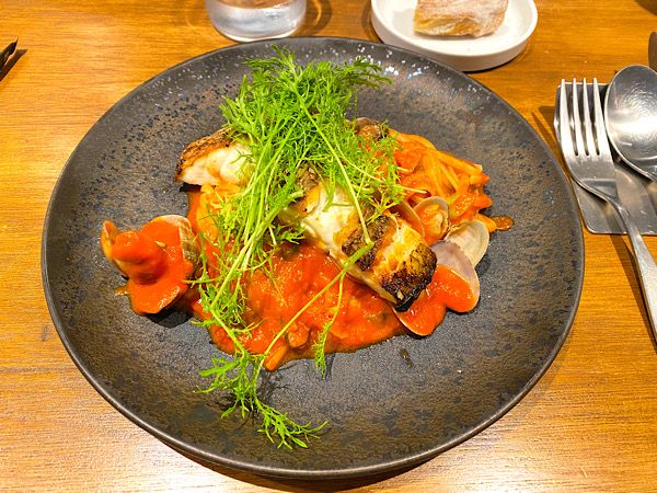 「鯛のポワレ 無農薬ネギと生姜のボンゴレロッソ」は、鯛の火加減が抜群で、皮はパリッとしていて中はふっくら。