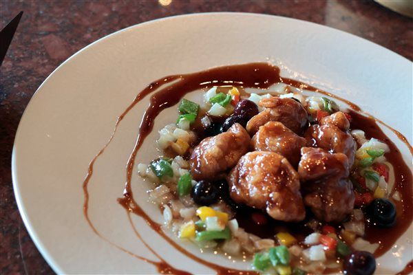今回私的に、一番気になったお料理がこちら。黒酢のブルーベリー酢豚。詳しいことはまた後で説明頂けるとのことで、まずは見るだけで。期待値が上がります。