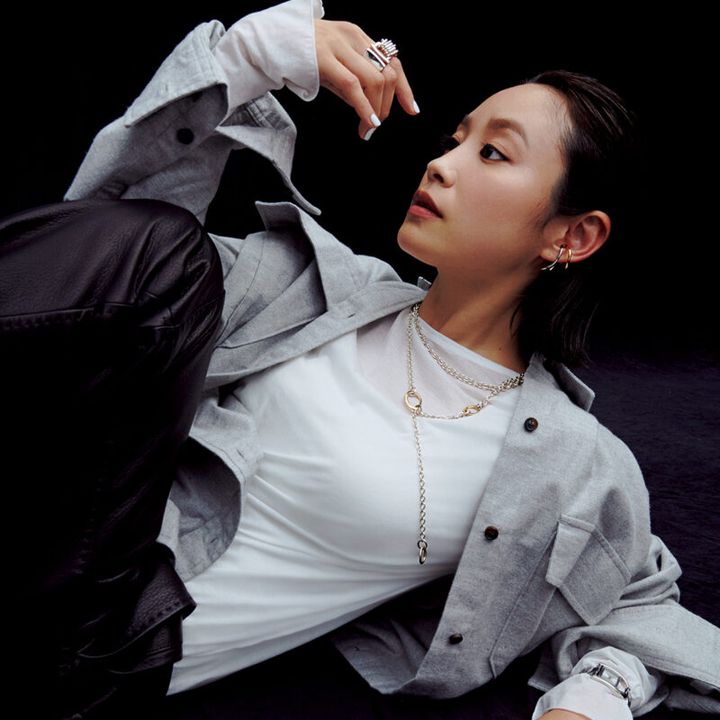 時計¥29,150(フォッシル/フォッシルジャパン) 右手中指リング[K24 ゴールドプレーテッドシルバー]¥33,000、人差し指リング[スターリングシルバー]¥35,200、ネックレス[チェーン部分:スターリングシルバー、サークルモチーフ部分:K24プレーテッドシルバー]¥77,000(すべてブランイリス/ブランイリス トーキョー) 左手ゴールドリング[真鍮]¥35,200(アニカイネズ/トゥモローランド) イヤカフ[真鍮]¥12,100(ソワリー) ビッグシャツ¥19,800(バビロン/エレメントルール カスタマーサービス) 中に着たカットソー¥13,970(シップス プライマリー ネイビー レーベル/シップス インフォメーションセンター) パンツ¥119,900(ギャルリー・ヴィー/ギャルリー・ヴィー 丸の内店)