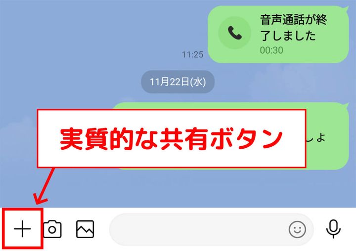 LINEでは、友だちの連絡先や自分の位置情報、他のトークルームの画像や動画を共有することが可能。「共有ボタン」というものはありませんが、トークルーム左下の「+」ボタンから様々なものを共有できます。