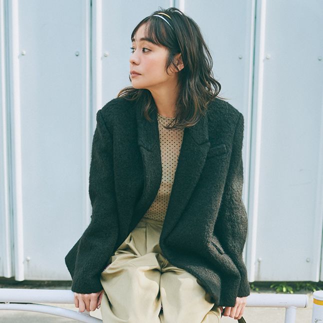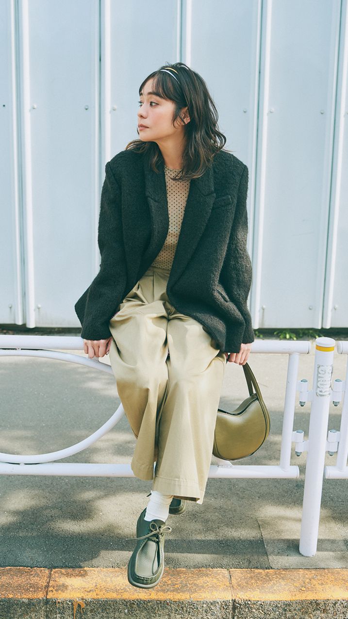 「ビッグシルエットのジャケットにチノパンといった一見メンズライクなスタイルで、中だけガーリーなドット柄の透けトップスに。ギャップ萌えを狙ってみました(笑)。カチューシャなどのヘア小物もちょっと甘さを足したいときに便利」