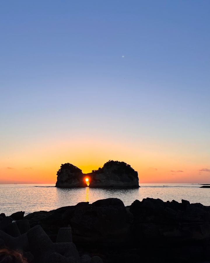 水平線に太陽が沈む様子をちょうど岩の隙間から見る事ができるのが魅力。