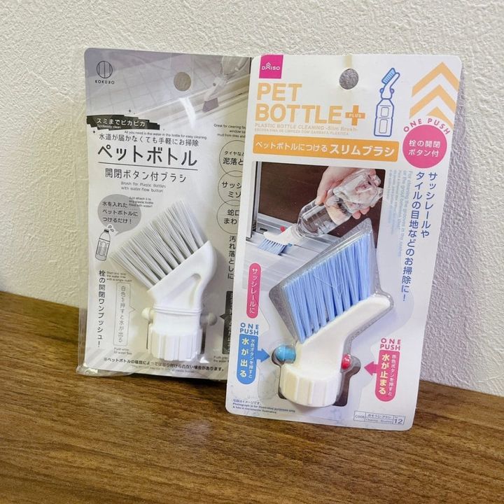 ペットボトル開閉ボタン付きブラシ(キャンドゥ) ペットボトルにつけるスリムブラシ(ダイソー)