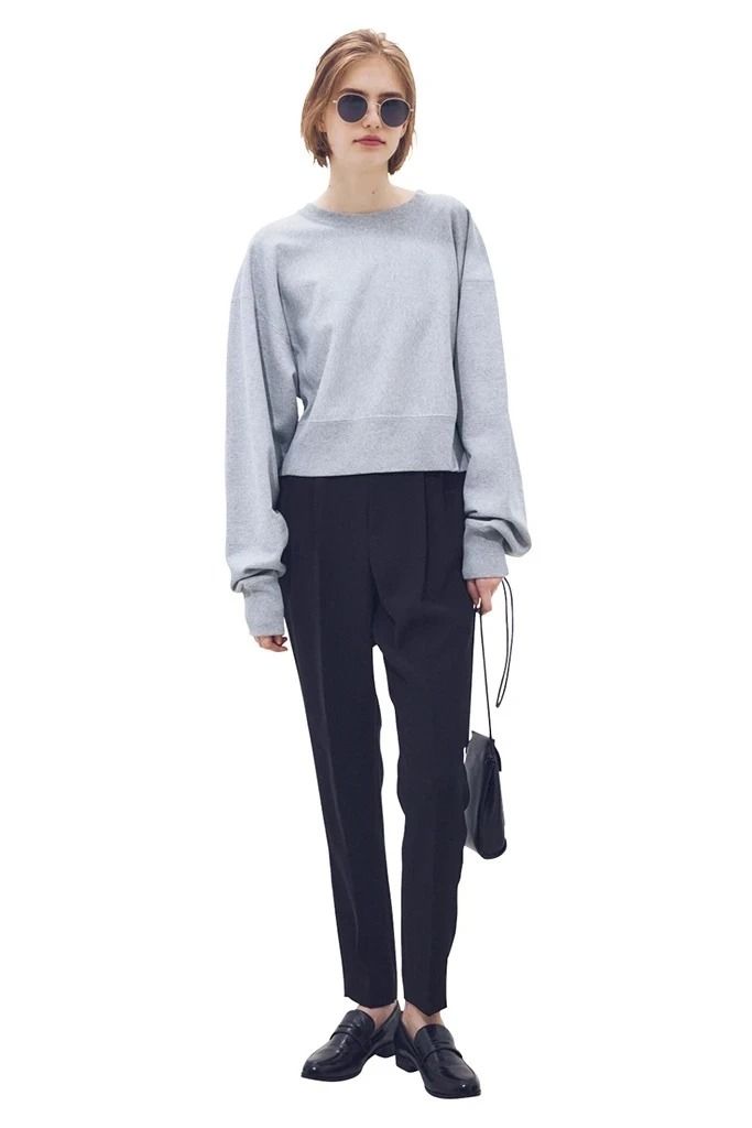 黒パンツ 23,100円/ENFÖLD グレーショートスエット 15,400円/FRAY I.D(FRAY I.D ルミネ新宿2店) サングラス 46,640円/Oliver Peoples(ルックスオティカジャパン カスタマーサービス) 黒バッグ 17,600円/マロウ(レイ ビームス 新宿) ローファー 16,390円/A de Vivre