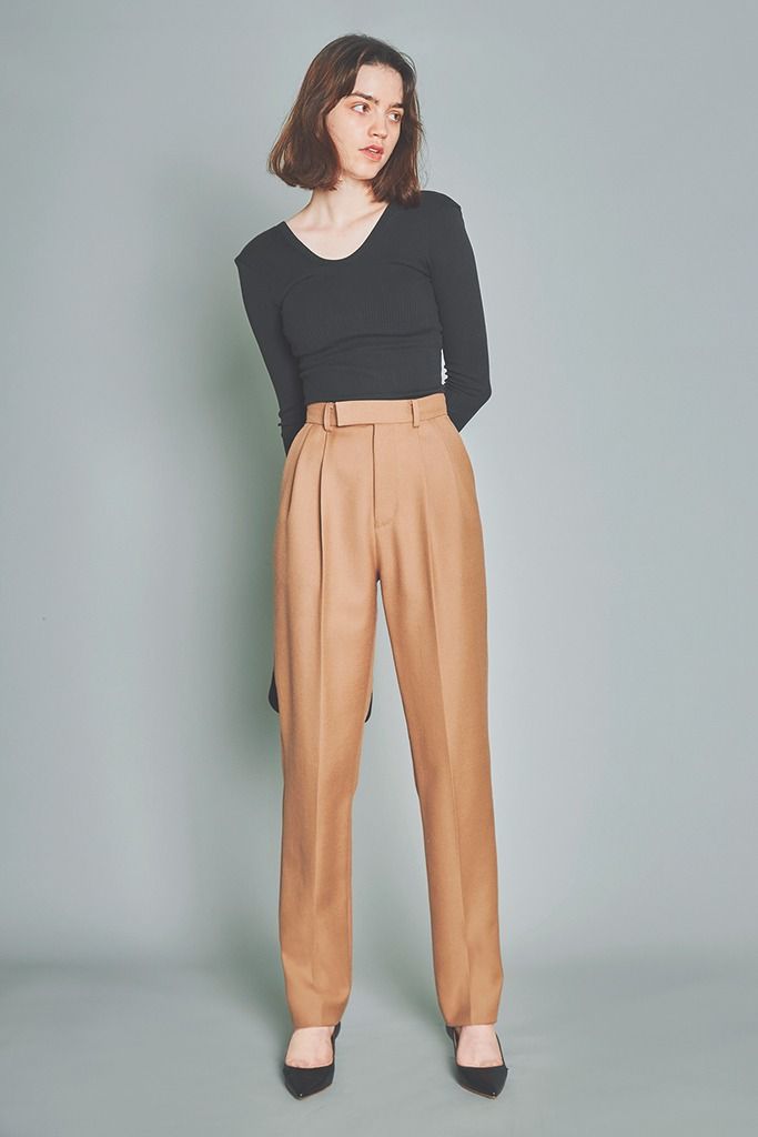 程よい厚みがありながらもシワにならない、柔らかい落ち感のある生地。前後にセンタープレス入りで、自然なゆとりを演出できるツータック入りのテーパードシルエット。股上はやや深めに、ヒップ周りに余裕をもたせつつ、ウエストをキュッと絞ることでメリハリもついて美しいシルエットに。