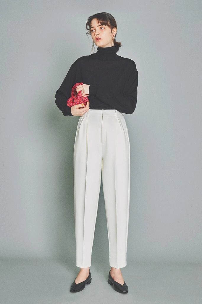 白パンツ 18,150円/AMERI(Ameri VINTAGE) 黒タートルネック 34,100円/イレーヴ ピアス 22,720円/BULBS(ZUTTOHOLIC) バッグ 13,200円/HELOYSE(ジャック・オブ・オール・トレーズ プレスルーム) シューズ 14,300円/ル タロン グリーズ(ル タロン グリーズ ルミネ新宿店)