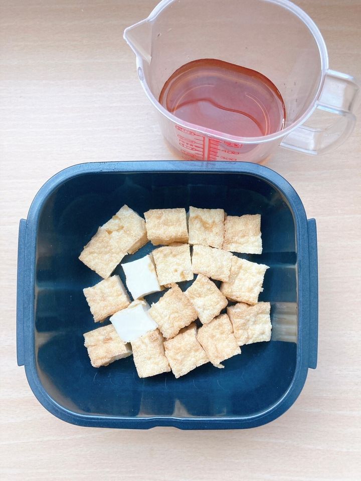 レンジでチンして、あとは放置で作れる厚揚げの煮浸し。冷ましながら味を染み込ませるので、調理の一番最初に作るのがおすすめです。