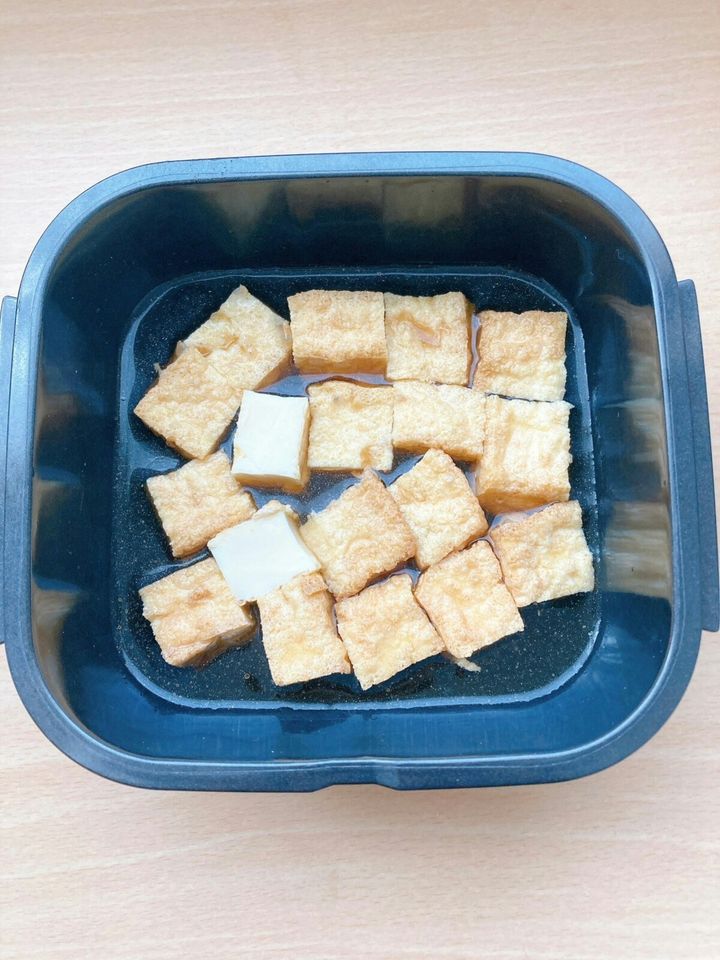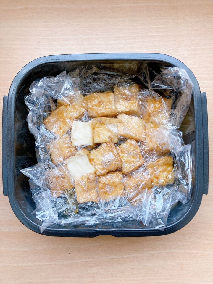 落し蓋をするように厚揚げにラップをかけ600wのレンジで6分加熱する。